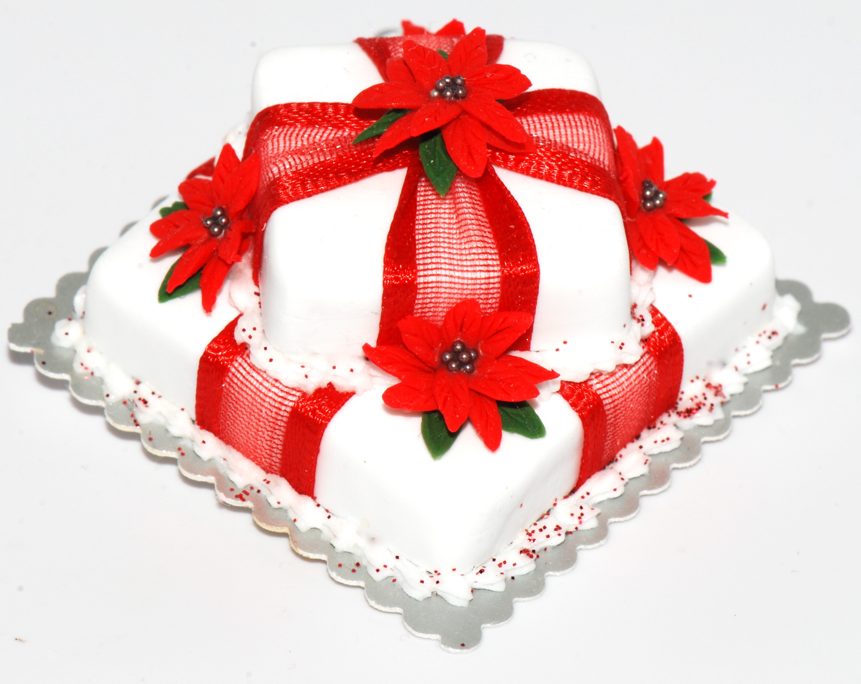This is a 1:12 square 2 tiered Christmas cake decorated with red ribbon and poinsettia's. A wonderful Christmas addition.