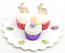 This is a very fun plaid bunny cupcake set that comes on a 1 inch plate with eggs printed on the side. One cupcake has tiny little easter eggs on it!