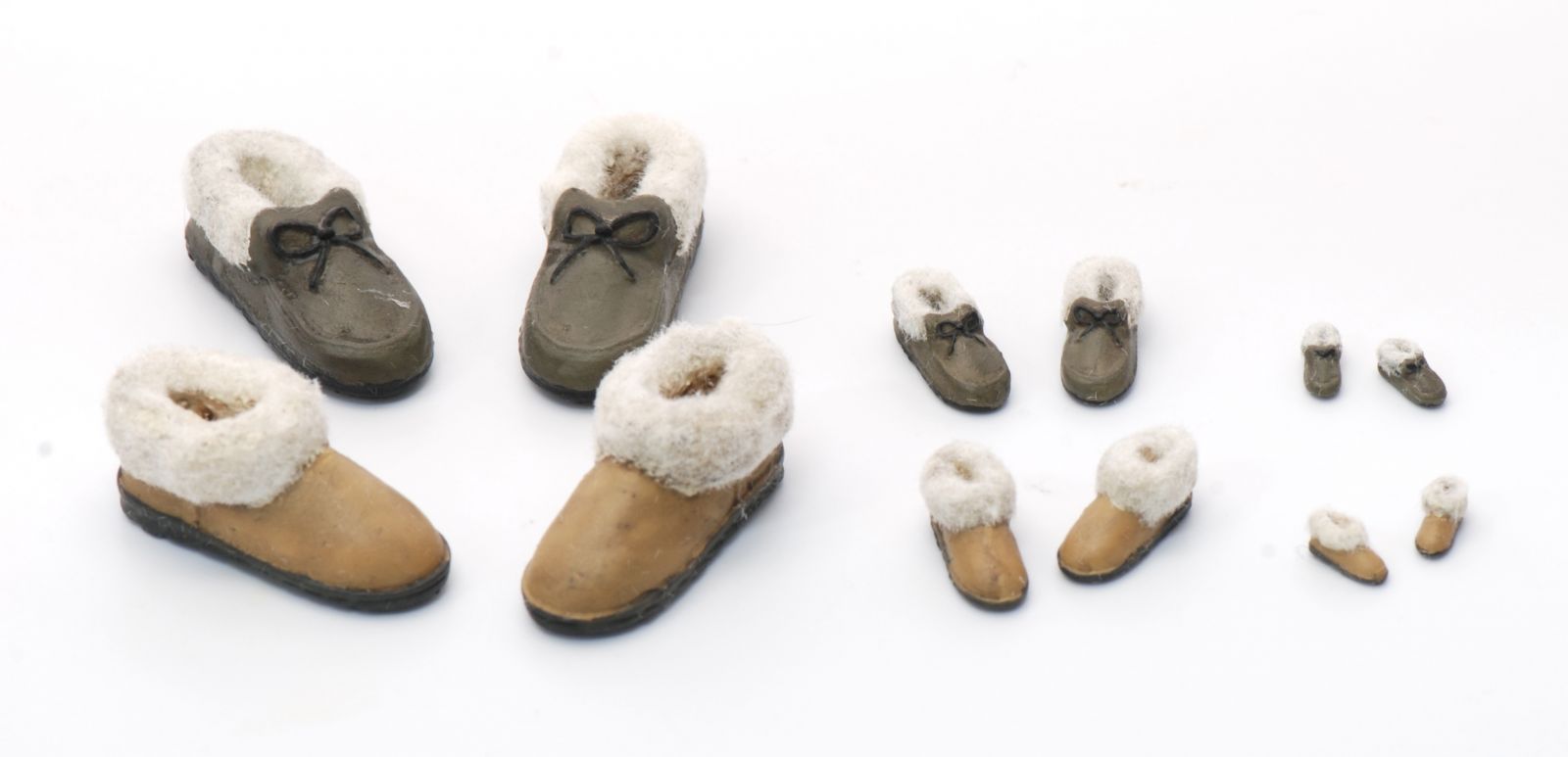 Lamps are availbe in 1:12 and 1:48 scales. The Postcard Rack and Diner Baskets in 1:12. The shoes in all 3 scales! The Eiffel Towers come in a set with 3 sizes.