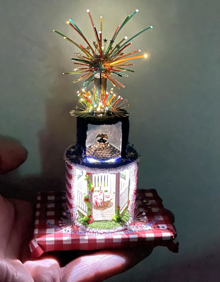 This new cake house sits on a picnic table base with a gingham table cloth on top. Tiny little ants are climbing to see what’s in the picnic basket! There is a Gazebo in the inside with a 4th of July summer park background and the little picnic basket. You go into the second tier and it’s covered in clouds and the gazebo roof has an eagle on top. Up on the top of the cake is your fireworks celebration at night… The whole thing lights up and you have sprays of stars everywhere you want to put them! There is no frosting on this one and the edges are covered with Bunka thread. The cake fondant is an American Flag. Stripes on the bottom and stars on top. AND… there is awesome templates to help you do this part quickly and perfectly!