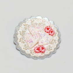 This is a collection of 3 Valentines Day heart shaped cookies. They are 3/16" big and come frosted with white frosting and purple sprinkles. Also tiny heart candies make up this treat!