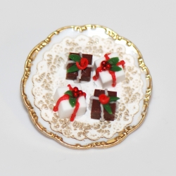 This is a small plate of petit fours, handcrafted from Sculpey clay. They are only 1/16" big and comes on a 5/8" pastry plate with an intricate doily. These are a wonderful addition to your miniature Bakery or table of pastries.