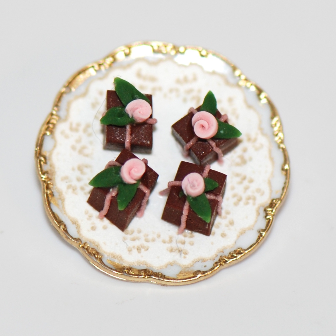 This is a small plate of petit fours, handcrafted from Sculpey clay. They are only 1/16" big and comes on a 5/8" pastry plate with an intricate doily. These are a wonderful addition to your miniature Bakery or table of pastries.