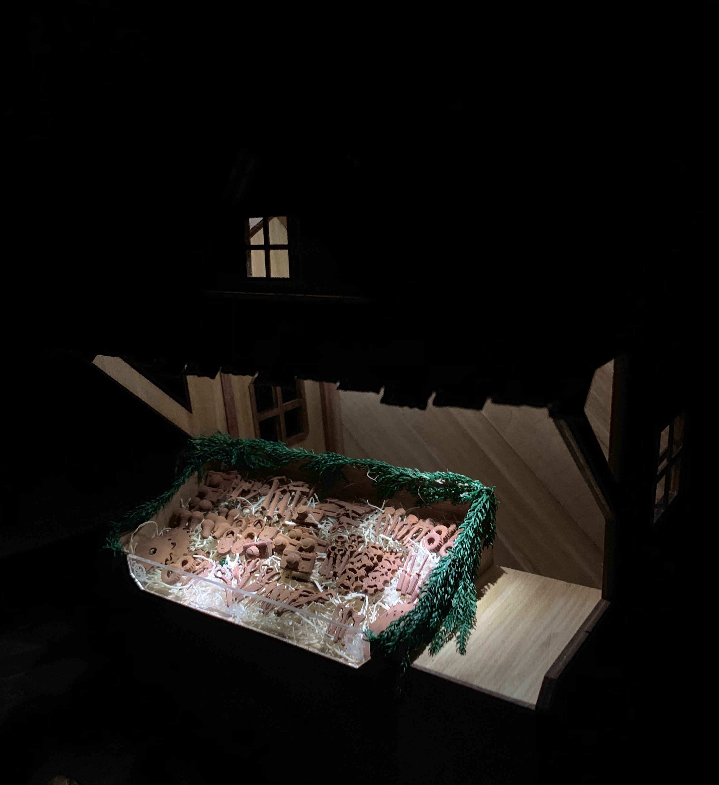 The lighting is completely done and ready to just put in place, batteries included as well. Kit comes with beautiful laser cut shingles on a textured wood grained paper, beautiful laser cut wood floor that is so beautiful you can just install it! Greenery included as well. Mold comes with this kit to make all your chocolates. Detailed step by step color directions are included.